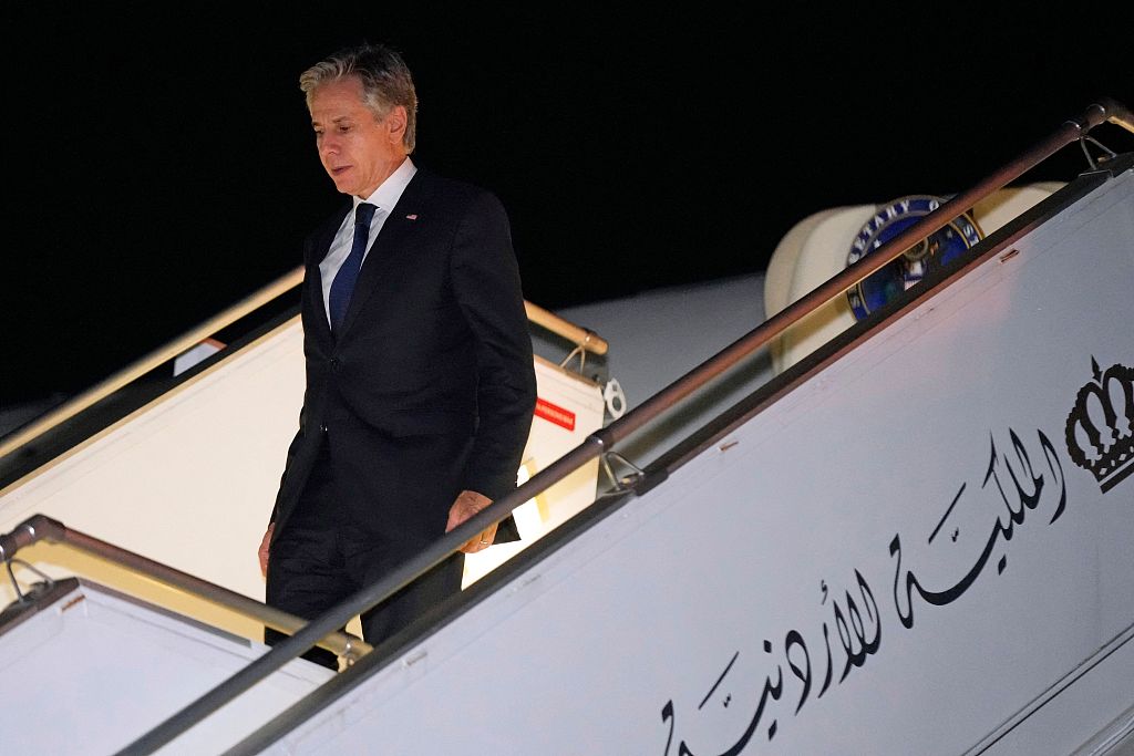 當(dāng)?shù)貢r間2023年10月17日,約旦安曼,美國國務(wù)卿安東尼·布林肯走下飛機(jī)。