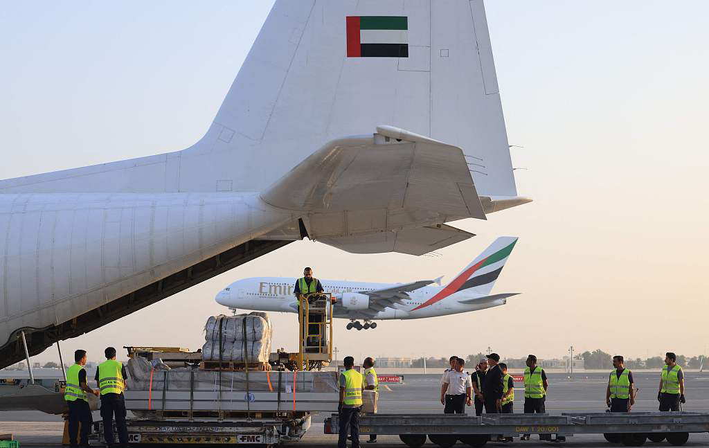 當(dāng)?shù)貢r間2023年10月17日,阿聯(lián)酋迪拜,阿聯(lián)酋向加沙地帶提供人道主義救援物資,運(yùn)輸機(jī)飛離迪拜機(jī)場。