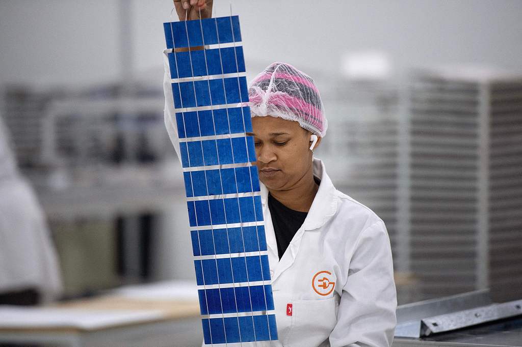 當(dāng)?shù)貢r(shí)間2023年10月25日,南非開(kāi)普敦,一名婦女在只有女性員工的太陽(yáng)能電池板工廠“非洲能源”檢查組件。