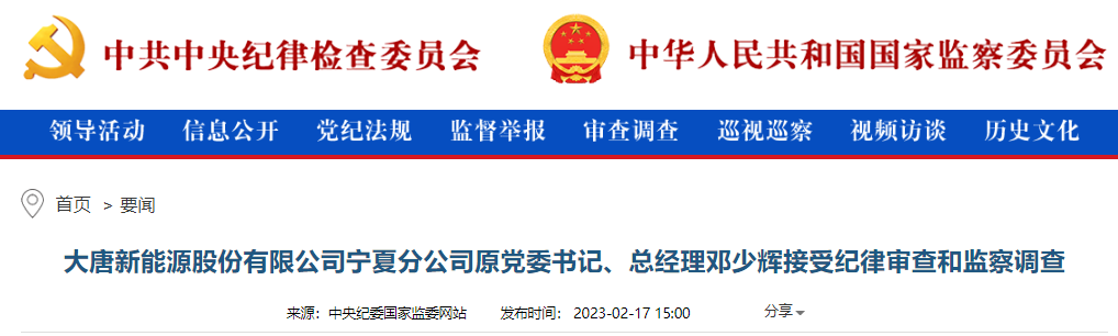 中央紀(jì)委國家監(jiān)委網(wǎng)站2月17日消息,據(jù)中國大唐集團(tuán)有限公司紀(jì)檢監(jiān)察組、寧夏回族自治區(qū)監(jiān)察委員會消息:大唐新能源股份有限公司寧夏分公司原黨委書記、總經(jīng)理鄧少輝涉嫌嚴(yán)重違紀(jì)違法,目前正接受中國大唐集團(tuán)有限公司紀(jì)檢監(jiān)察組紀(jì)律審查和寧夏回族自治區(qū)銀川市監(jiān)察委員會監(jiān)察調(diào)查。