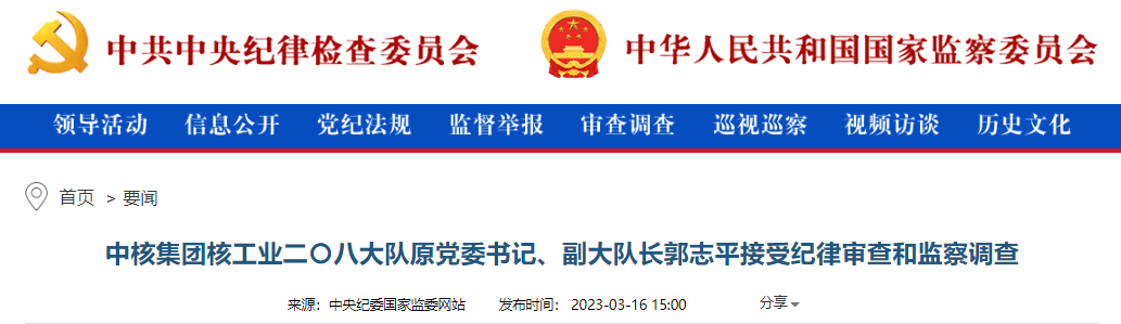 中央紀(jì)委國(guó)家監(jiān)委網(wǎng)站3月16日消息,中核集團(tuán)核工業(yè)二〇八大隊(duì)原黨委書(shū)記、副大隊(duì)長(zhǎng)郭志平涉嫌嚴(yán)重違紀(jì)違法,目前正接受中核集團(tuán)紀(jì)檢監(jiān)察組和內(nèi)蒙古自治區(qū)烏海市監(jiān)委紀(jì)律審查和監(jiān)察調(diào)查。