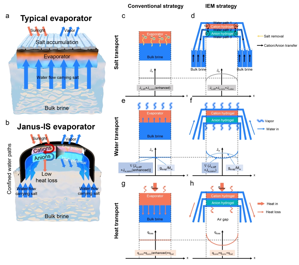 太陽能界面蒸發(fā)是一種新興的海水淡化技術(shù),其將蒸發(fā)器漂浮于海面上進(jìn)行界面光熱蒸發(fā),具有綠色、零能耗、低成本和結(jié)構(gòu)簡單等諸多優(yōu)勢,有望解決全球性淡水短缺問題。但光熱表面水汽化會造成鹽分積累,嚴(yán)重阻礙其長期運(yùn)行的穩(wěn)定性。將光熱層疏水化和強(qiáng)化對流傳質(zhì)是當(dāng)前抗積鹽的主要方法。前者避免海水到達(dá)光熱層來防止積鹽,但其同時增大了光熱層與海水之間的熱阻,降低蒸發(fā)速率。后者加快水對流從蒸發(fā)表面帶走鹽分,但同時也帶走了熱量,制約蒸發(fā)速率。因此,傳統(tǒng)方法無法解決鹽離子運(yùn)移和高效熱利用之間的矛盾,積鹽問題仍是界面蒸發(fā)所面臨的最嚴(yán)峻挑戰(zhàn)之一。