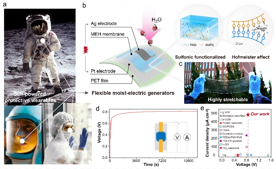 為解決上述問題,該團(tuán)隊聚焦于水凝膠聚合物材料,其不僅擁有良好的柔韌性,而且內(nèi)部具有大量的微納結(jié)構(gòu)和官能團(tuán),可吸附并儲存大量水分。然而,這種柔性材料的離子傳導(dǎo)率較差,難以直接用于濕電轉(zhuǎn)化。為此,該團(tuán)隊提出了一種水凝膠分子工程策略,通過在其單個聚合鏈分子結(jié)構(gòu)上進(jìn)行微觀設(shè)計,顯著提高了水凝膠的離子傳導(dǎo)特性和可拉伸性。該分子工程策略是將磺酸基團(tuán)和鋰離子嵌入到聚合鏈分子結(jié)構(gòu)中。其中,磺酸基團(tuán)賦予聚合鏈更穩(wěn)健的分子結(jié)構(gòu)及電離特性,而鋰離子能夠誘導(dǎo)產(chǎn)生霍夫邁斯特效應(yīng),拓寬聚合鏈之間的間距并構(gòu)建出大量的離子傳輸通道?;诜肿庸こ趟z構(gòu)建的濕氣發(fā)電器獲得了高達(dá)480 μA cm-2的短路電流密度,是大多數(shù)已報道的濕氣發(fā)電器的十倍以上。同時,其可承受500%以上的拉伸形變而不被破壞,是目前已報道的濕電轉(zhuǎn)化材料的最高水平。該濕氣發(fā)電器能夠?qū)⑷梭w呼吸過程中產(chǎn)生的濕氣轉(zhuǎn)化為電能,為電子設(shè)備提供動力。該工作推動了濕氣發(fā)電技術(shù)向可穿戴電子設(shè)備的應(yīng)用。