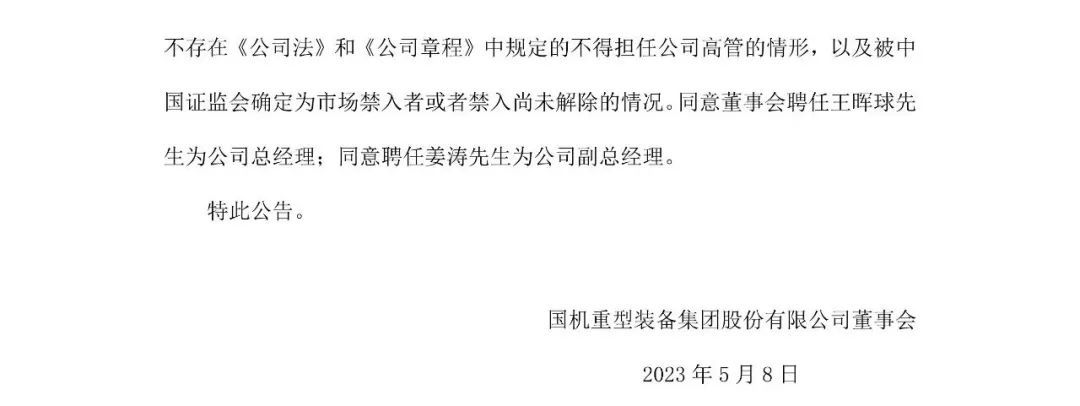5月6日,國機(jī)重裝董事會(huì)審議通過了《關(guān)于聘任公司總經(jīng)理、副總經(jīng)理的議案》,同意聘任王暉球?yàn)楣究偨?jīng)理;同意聘任姜濤為公司副總經(jīng)理。