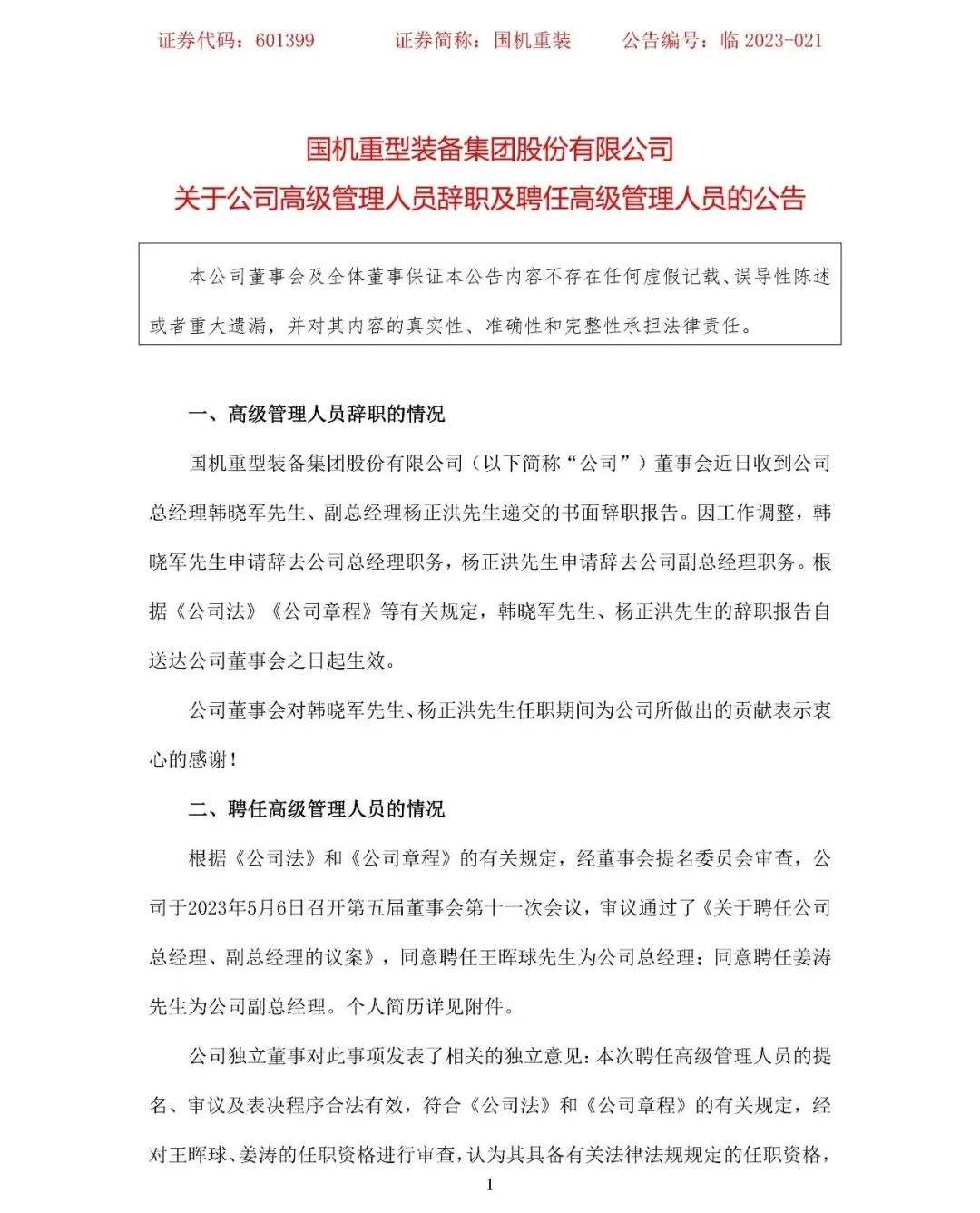 5月8日,國機(jī)重裝發(fā)布公告,董事會(huì)近日收到公司總經(jīng)理韓曉軍、副總經(jīng)理?xiàng)钫檫f交的書面辭職報(bào)告。因工作調(diào)整,韓曉軍申請(qǐng)辭去公司總經(jīng)理職務(wù),楊正洪申請(qǐng)辭去公司副總經(jīng)理職務(wù)。