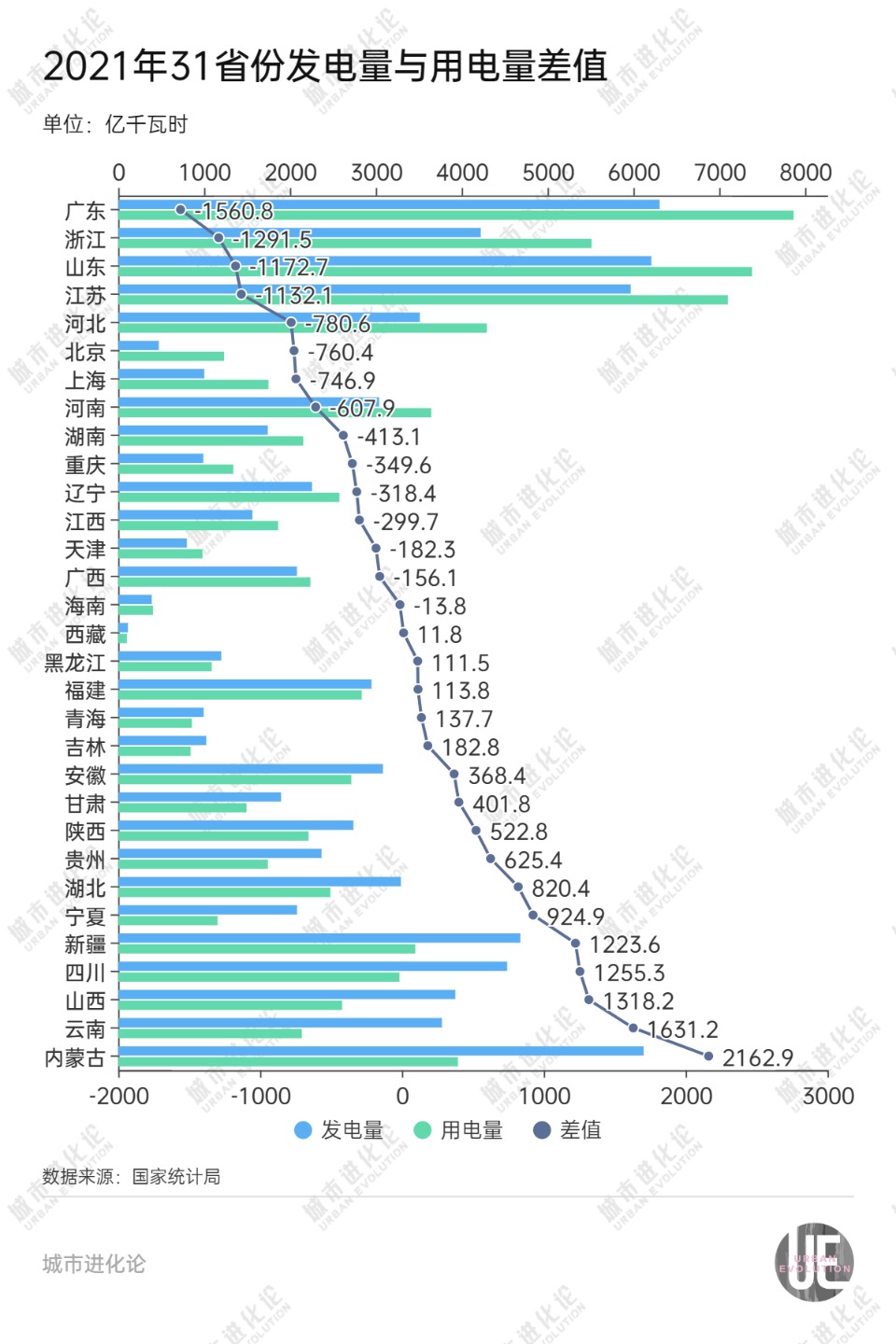 而在此前一年,廣東、浙江的凈貢獻均低于山東。換句話說,山東的電力缺口從2021年1172.7億千瓦時擴大到1836.4億千瓦時,增幅超過50%。相比之下,用電第一大省廣東的增幅為13%。