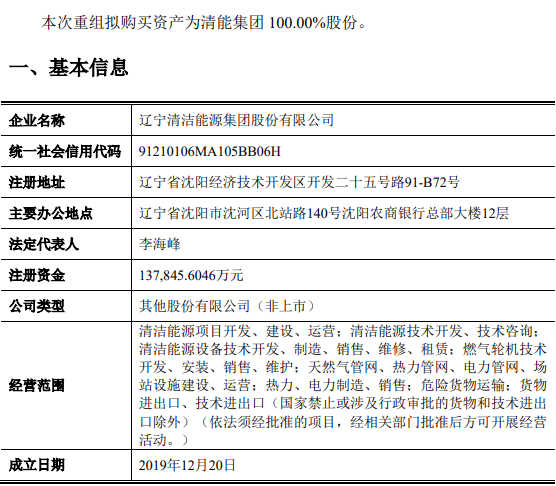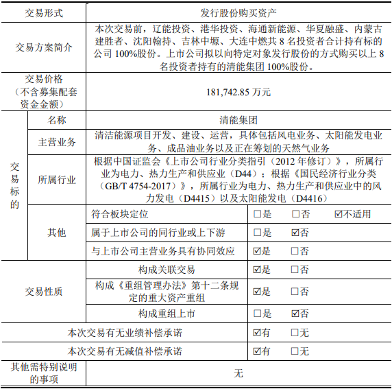 根據(jù)此前公告披露,遼寧能源擬作價18.17億元,以發(fā)行股份的方式收購遼能投資、港華投資、海通新能源等共8名投資者合計持有的遼寧清潔能源集團(簡稱:清能集團)100%股份,并募集配套資金10億元,用于遼能康平300MW風(fēng)電項目、遼能南票200MW風(fēng)電項目、償還上市公司債務(wù)。