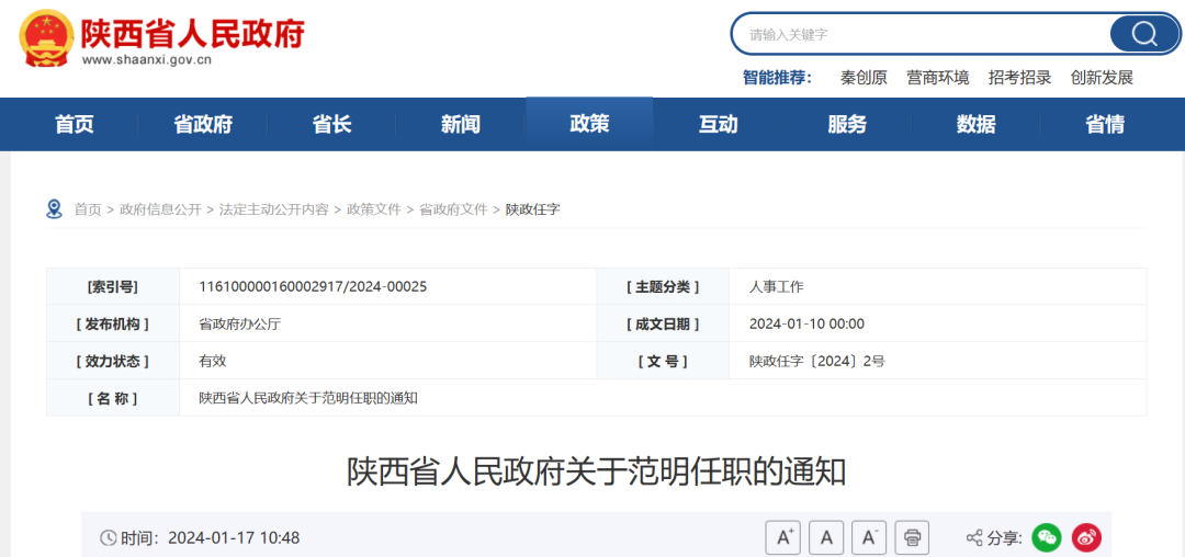 省政府2024年1月10日研究,同意范明為中陜核工業(yè)集團(tuán)有限公司總經(jīng)理人選。