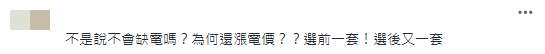 相關(guān)消息也引起島內(nèi)網(wǎng)民吐槽,有網(wǎng)民在臺(tái)媒留言區(qū)批評(píng)稱,“不是說不會(huì)缺電嗎?為何還漲電價(jià)?選前一套!選后又一套”。