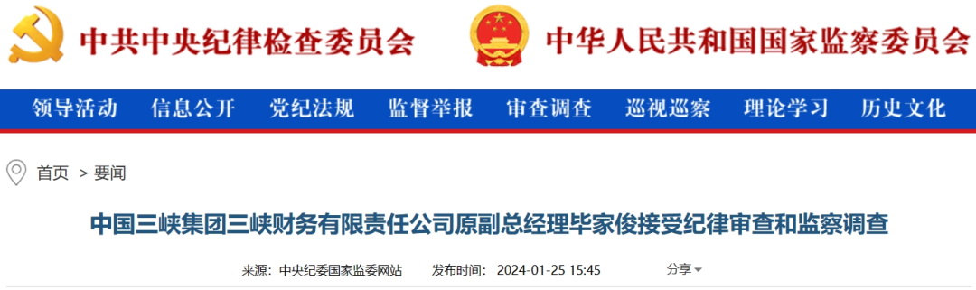 中央紀委國家監(jiān)委網(wǎng)站1月25日消息,據(jù)中國三峽集團紀檢監(jiān)察組、湖北省紀委監(jiān)委消息:中國三峽集團三峽財務有限責任公司原副總經(jīng)理畢家俊涉嫌嚴重違紀違法,目前正接受中國三峽集團紀檢監(jiān)察組和湖北省天門市監(jiān)委紀律審查和監(jiān)察調查。