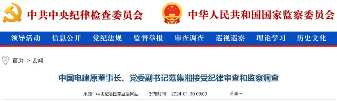 2024年1月30日,據(jù)中央紀(jì)委國家監(jiān)委駐國務(wù)院國資委紀(jì)檢監(jiān)察組、江西省紀(jì)委監(jiān)委消息:中國電建原董事長、黨委副書記范集湘涉嫌嚴(yán)重違紀(jì)違法,接受中央紀(jì)委國家監(jiān)委駐國務(wù)院國資委紀(jì)檢監(jiān)察組和江西省監(jiān)委紀(jì)律審查和監(jiān)察調(diào)查。