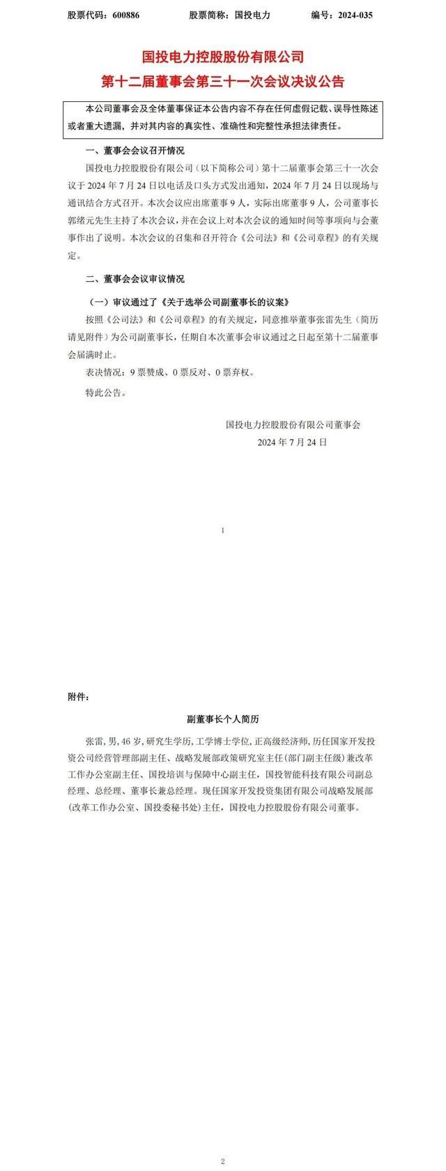 7月24日,國(guó)投電力發(fā)布公告,董事會(huì)審議通過了《關(guān)于選舉公司副董事長(zhǎng)的議案》,同意推舉董事張雷先生為公司副董事長(zhǎng),任期自本次董事會(huì)審議通過之日起至第十二屆董事會(huì)屆滿時(shí)止。