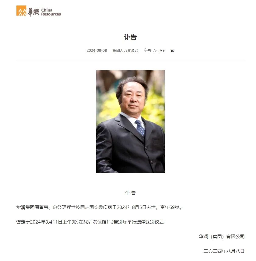 華潤(rùn)集團(tuán)原董事、總經(jīng)理喬世波因突發(fā)疾病于2024年8月5日去世,享年69歲。