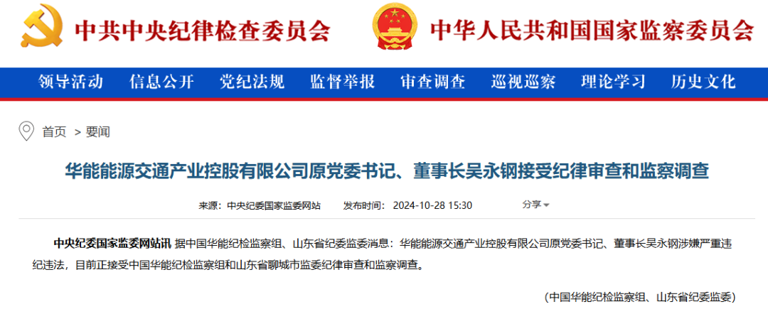 據(jù)中國華能紀檢監(jiān)察組、山東省紀委監(jiān)委消息:華能能源交通產業(yè)控股有限公司原黨委書記、董事長吳永鋼涉嫌嚴重違紀違法,目前正接受中國華能紀檢監(jiān)察組和山東省聊城市監(jiān)委紀律審查和監(jiān)察調查。