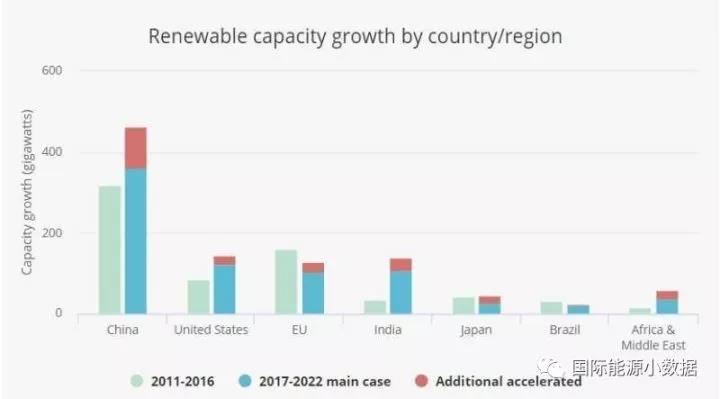 過去對(duì)于可再生能源發(fā)展規(guī)模預(yù)測(cè)曾經(jīng)偏保守的IEA現(xiàn)在預(yù)測(cè),2017-2022年間全球可再生能源新增裝機(jī)將至少達(dá)到920吉瓦(其中風(fēng)電321吉瓦、光伏438吉瓦),其中363吉瓦(39%)將來自中國。如果各國政策支持力度加大的樂觀情形下,2017-2022年間可再生能源新增裝機(jī)可能達(dá)到1150吉瓦,其中464吉瓦(40%)來自中國。