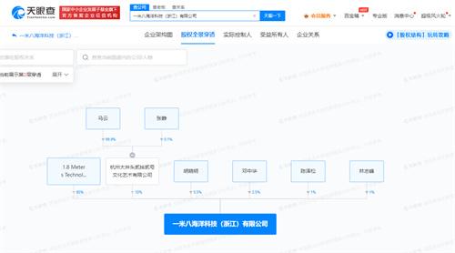 股權(quán)全景穿透圖顯示,該公司由1.8Meters Technology Holding Limited、杭州大井頭貳拾貳號(hào)文化藝術(shù)有限公司以及胡曉明等4名自然人共同持股。其中,杭州大井頭貳拾貳號(hào)文化藝術(shù)有限公司由馬云持股99.9%;持有一米八海洋科技5.5%股權(quán)并擔(dān)任董事長(zhǎng)的胡曉明則曾任螞蟻集團(tuán)CEO。