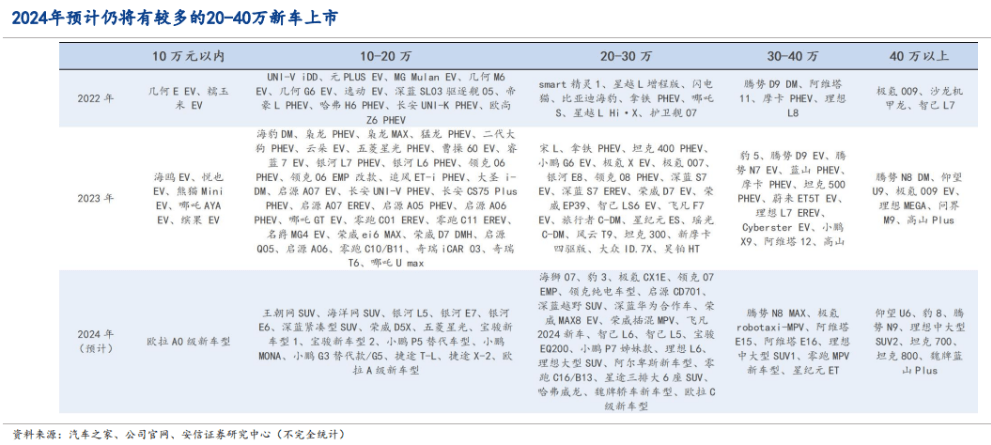 安信證券研究中心發(fā)布的研究報告認為,新能源車高端化仍有較大的空間。在40萬元以上的市場中,新能源汽車滲透率相對較低,相關(guān)數(shù)據(jù)顯示,2023年1-10月僅為17.5%,與40萬以下市場相比,新能源滲透率仍有較大的提升空間。安信證券研究中心預(yù)測,2024年高端新能源車銷量及占比有望持續(xù)提升,在多款全新高端車型上市的催化下,2024年20萬-30萬元、30萬-40萬、40萬元以上新能源車銷售占比將達28.4%、11.4%及6%,新能源車行業(yè)結(jié)構(gòu)有望進一步高端化。