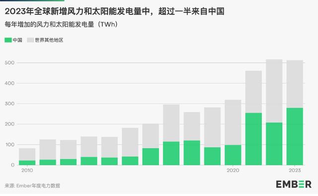 報(bào)告重點(diǎn)分析了中國的情況:中國在推進(jìn)全球能源轉(zhuǎn)型中扮演著舉足輕重的角色。中國是風(fēng)力和太陽能發(fā)電的全球領(lǐng)導(dǎo)者,擁有十多年來最大的絕對發(fā)電量和最高的年增加量。其以極快的速度增加風(fēng)力和太陽能發(fā)電量,改變?nèi)蜃畲蟮碾娏ο到y(tǒng)。僅2023年,中國就貢獻(xiàn)了全球一半以上的新增風(fēng)能和太陽能發(fā)電量,占全球太陽能和風(fēng)能發(fā)電量的37%。