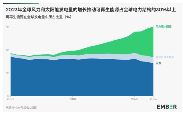 5月8日,根據(jù)全球能源智庫Ember的最新報(bào)告:2023 年,得益于太陽能和風(fēng)力發(fā)電量的增長,可再生能源發(fā)電量在全球發(fā)電量中的占比達(dá)到了前所未有的30%。2023年或?qū)⒊蔀殡娏π袠I(yè)碳排放量達(dá)到峰值的標(biāo)志性轉(zhuǎn)折點(diǎn)。