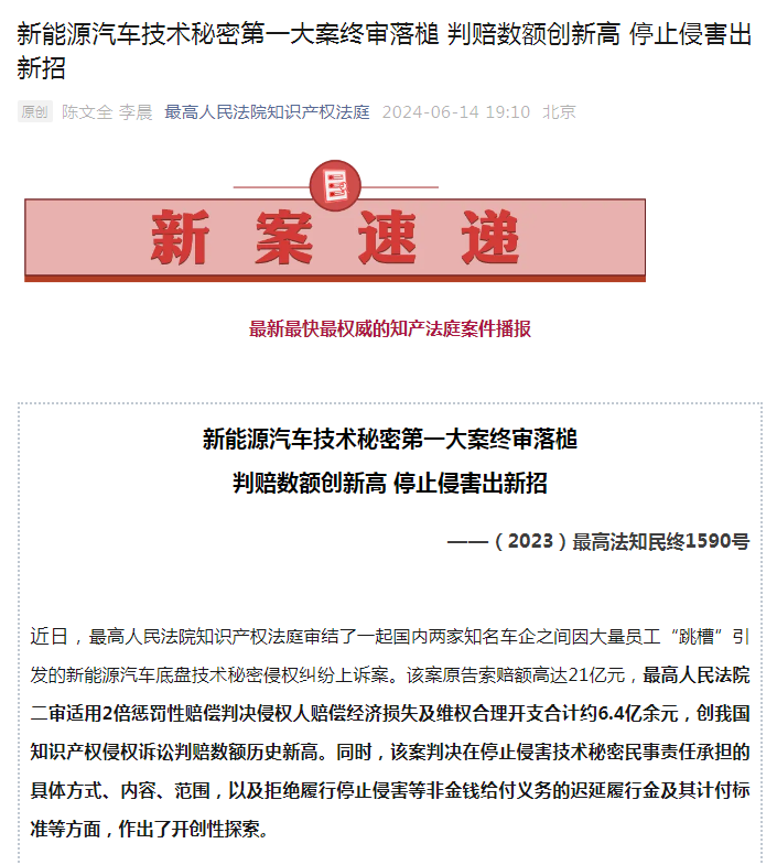 北京歷時(shí)6年,吉利起訴威馬竊取商業(yè)機(jī)密和技術(shù)侵權(quán)案件近日終審落槌。據(jù)最高人民法院知識(shí)產(chǎn)權(quán)法庭發(fā)布的《(2023)最高法知民終1590號(hào)新能源汽車(chē)底盤(pán)技術(shù)秘密侵權(quán)案民事判決書(shū)》顯示,原告吉利方勝訴,威馬方敗訴需賠償吉利方6.4億余元,創(chuàng)我國(guó)知識(shí)產(chǎn)權(quán)侵權(quán)訴訟判賠數(shù)額歷史新高。
