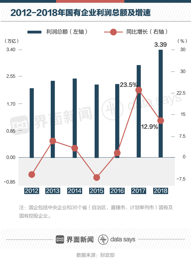 財政部數(shù)據(jù)顯示,2012年以來,國有企業(yè)利潤額總體保持增長勢頭。2015年國企利潤總額小幅下跌后,在2016年開始回升,并在2017年實現(xiàn)大幅反彈。2018年國企利潤總額達(dá)3.39萬億,創(chuàng)歷史新高。
