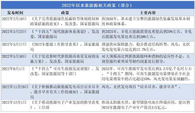 從2022年發(fā)布的新能源相關(guān)政策來看,國家層面絲毫未放松對(duì)新能源產(chǎn)業(yè)的推動(dòng)。從完善能源轉(zhuǎn)型基本機(jī)制,到具體規(guī)劃和目標(biāo),以及清潔能源的儲(chǔ)能和并網(wǎng),甚至到推動(dòng)新能源在行業(yè)終端的應(yīng)用,在多個(gè)階段不同層面都作出了政策指引。