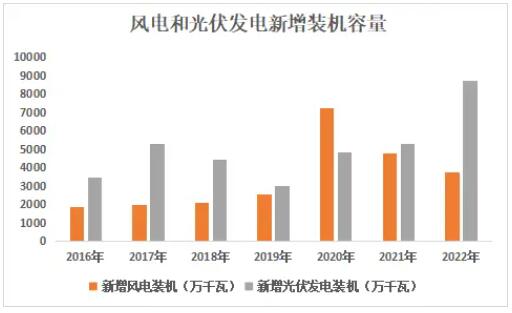2022年光伏發(fā)電的新增容量為8741萬千瓦,較2021年大幅增長(zhǎng)了65%;風(fēng)電的新增裝機(jī)為3763萬千瓦,同比反而下降了21%。風(fēng)電的發(fā)展起步較早,此前總裝機(jī)容量一直高于光伏。但近年來由于光伏裝機(jī)量的迅速攀升,而風(fēng)電進(jìn)入平價(jià)上網(wǎng)后裝機(jī)步伐放緩,2022年光伏發(fā)電的累計(jì)裝機(jī)規(guī)模首次超過風(fēng)電。