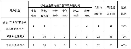 2. 對于居民用戶和實行“三零”服務(wù)的低壓非居民用戶,用電報裝壓減為受理簽約、施工接電2個環(huán)節(jié),在工作目標中已規(guī)定全過程辦理時間。