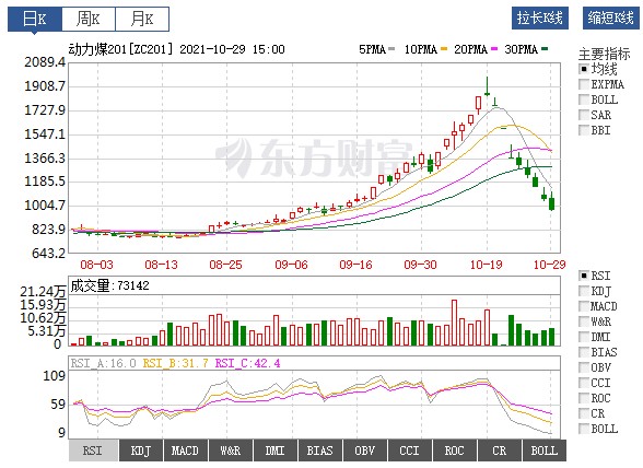 10月28日,受政策監(jiān)管沖擊,煤炭股市、期貨市場延續(xù)跌勢,煤炭概念跳水跌超6%,兗州煤業(yè)( 600188.SH )等多股跌停。商品期貨方面,動力煤跌2.25%,而在此之前的幾個交易日,以鄭商所動力煤為例,其價格直接攔腰斬斷,從10月19日每噸1982元高點直落至10月28日夜間收市的1041元。