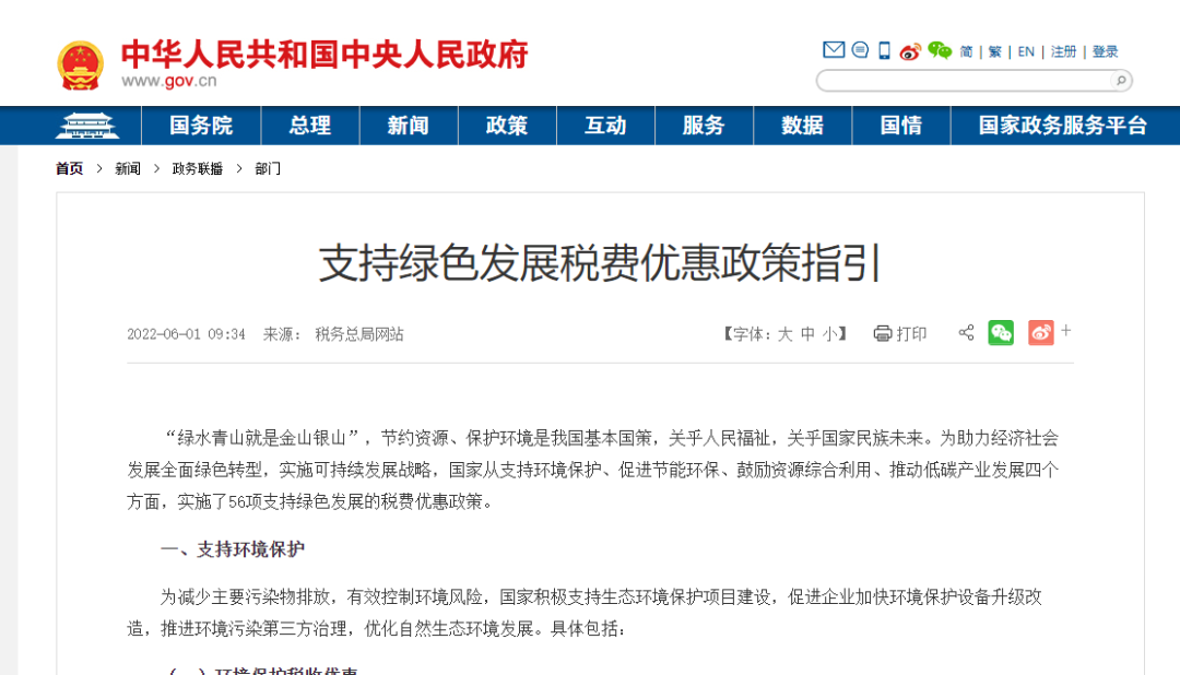 為著眼于國(guó)家碳達(dá)峰碳中和戰(zhàn)略部署,充分體現(xiàn)稅收對(duì)市場(chǎng)主體綠色低碳發(fā)展的促進(jìn)和激勵(lì)作用,國(guó)家稅務(wù)總局日前發(fā)布《支持綠色發(fā)展稅費(fèi)優(yōu)惠政策指引》,從支持環(huán)境保護(hù)、促進(jìn)節(jié)能環(huán)保、鼓勵(lì)資源綜合利用、推動(dòng)低碳產(chǎn)業(yè)發(fā)展四個(gè)方面,實(shí)施了56項(xiàng)支持綠色發(fā)展的稅費(fèi)優(yōu)惠政策。