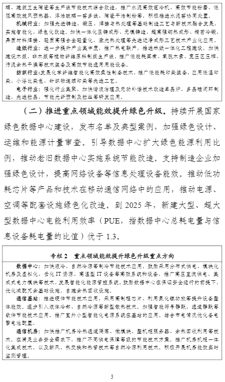 計劃提出,到2025年,重點工業(yè)行業(yè)能效全面提升,數(shù)據(jù)中心等重點領(lǐng)域能效明顯提升,綠色低碳能源利用比例顯著提高,節(jié)能提效工藝技術(shù)裝備廣泛應(yīng)用,標(biāo)準(zhǔn)、服務(wù)和監(jiān)管體系逐步完善,鋼鐵、石化化工、有色金屬、建材等行業(yè)重點產(chǎn)品能效達到國際先進水平,規(guī)模以上工業(yè)單位增加值能耗比2020年下降13.5%。能盡其用、效率至上成為市場主體和公眾的共同理念和普遍要求,節(jié)能提效進一步成為綠色低碳的“第一能源”和降耗減碳的首要舉措。