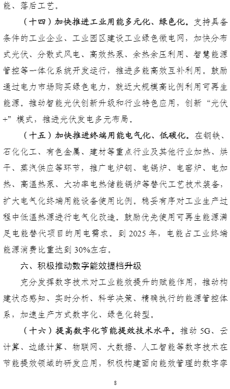 加快推進終端用能電氣化、低碳化。在鋼鐵、石化化工、有色金屬、建材等重點行業(yè)及其他行業(yè)加熱、烘干、蒸汽供應(yīng)等環(huán)節(jié),推廣電爐鋼、電鍋爐、電窯爐、電加熱、高溫?zé)岜?、大功率電熱儲能鍋爐等替代工藝技術(shù)裝備,擴大電氣化終端用能設(shè)備使用比例。穩(wěn)妥有序?qū)I(yè)生產(chǎn)過程中低溫?zé)嵩催M行電氣化改造。鼓勵優(yōu)先使用可再生能源滿足電能替代項目的用電需求。到2025年,電能占工業(yè)終端能源消費比重達到30%左右。