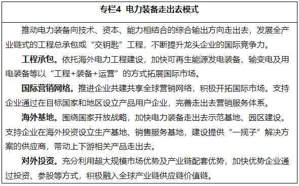 16.推動(dòng)電力裝備走出去。緊緊圍繞高質(zhì)量共建“一帶一路”、深入實(shí)施《區(qū)域全面經(jīng)濟(jì)伙伴關(guān)系協(xié)定》,鼓勵(lì)優(yōu)勢(shì)電力裝備企業(yè)以多種方式加快走出去。引導(dǎo)企業(yè)取得國(guó)際認(rèn)可的服務(wù)資質(zhì),帶動(dòng)技術(shù)、裝備、標(biāo)準(zhǔn)和服務(wù)走出去。支持行業(yè)組織搭建走出去信息綜合服務(wù)平臺(tái),提供法律、咨詢、風(fēng)險(xiǎn)評(píng)估等服務(wù)。