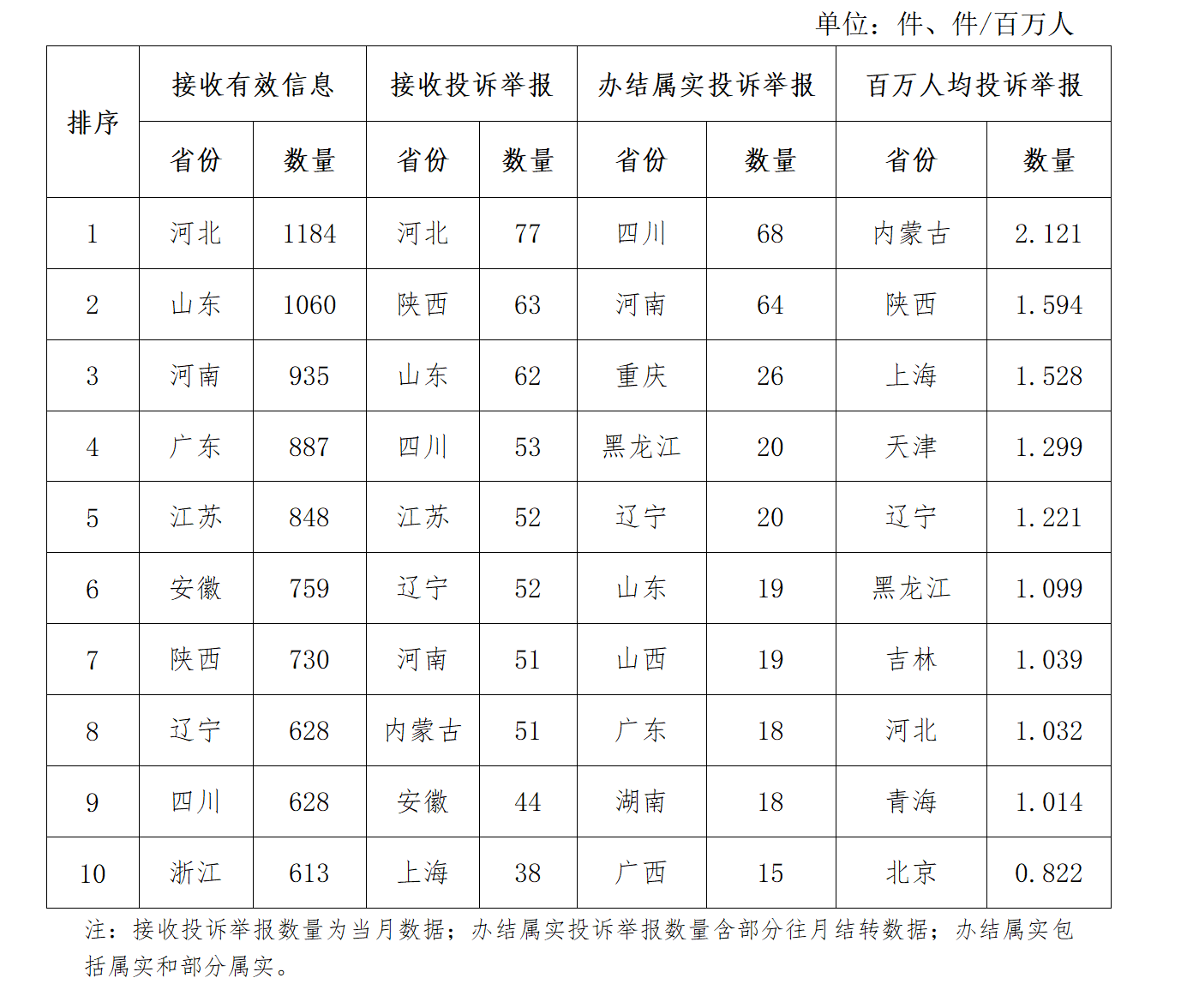 各省(自治區(qū)、直轄市)按照接收的有效信息數(shù)量排序,河北、山東、河南、廣東、江蘇、安徽、陜西、遼寧、四川、浙江排在全國前10位;按照接收的投訴舉報(bào)數(shù)量排序,河北、陜西、山東、四川、江蘇、遼寧、河南、內(nèi)蒙古、安徽、上海排在全國前10位;按照辦結(jié)屬實(shí)的投訴舉報(bào)數(shù)量排序,四川、河南、重慶、黑龍江、遼寧、山東、山西、廣東、湖南、廣西排在全國前10位;按照百萬人均投訴舉報(bào)數(shù)量排序,內(nèi)蒙古、陜西、上海、天津、遼寧、黑龍江、吉林、河北、青海、北京排在全國前10位。(2022年9月有效信息及投訴舉報(bào)排名前10位情況見表三)