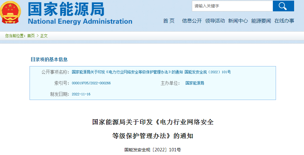 國家能源局發(fā)布《電力行業(yè)網(wǎng)絡(luò)安全等級(jí)保護(hù)管理辦法》
