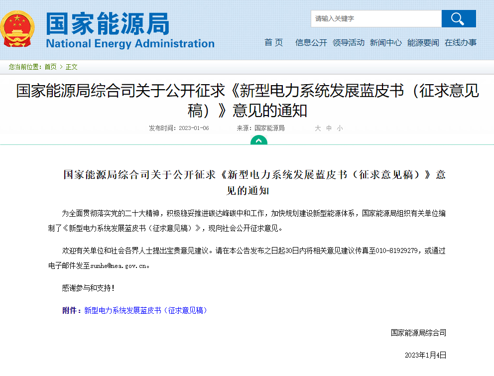 國(guó)家能源局綜合司關(guān)于公開征求《新型電力系統(tǒng)發(fā)展藍(lán)皮書(征求意見稿)》意見的通知