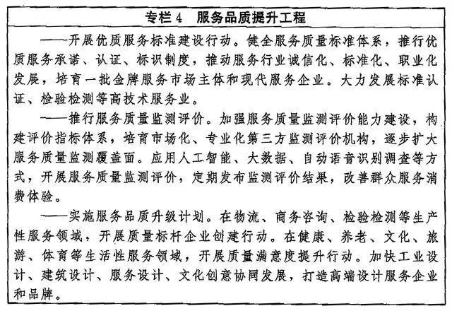 (七)提高產(chǎn)業(yè)質(zhì)量競(jìng)爭(zhēng)水平。推動(dòng)產(chǎn)業(yè)質(zhì)量升級(jí),加強(qiáng)產(chǎn)業(yè)鏈全面質(zhì)量管理,著力提升關(guān)鍵環(huán)節(jié)、關(guān)鍵領(lǐng)域質(zhì)量管控水平。開(kāi)展對(duì)標(biāo)達(dá)標(biāo)提升行動(dòng),以先進(jìn)標(biāo)準(zhǔn)助推傳統(tǒng)產(chǎn)業(yè)提質(zhì)增效和新興產(chǎn)業(yè)高起點(diǎn)發(fā)展。推進(jìn)農(nóng)業(yè)品種培優(yōu)、品質(zhì)提升、品牌打造和標(biāo)準(zhǔn)化生產(chǎn),全面提升農(nóng)業(yè)生產(chǎn)質(zhì)量效益。加快傳統(tǒng)制造業(yè)技術(shù)迭代和質(zhì)量升級(jí),強(qiáng)化戰(zhàn)略性新興產(chǎn)業(yè)技術(shù)、質(zhì)量、管理協(xié)同創(chuàng)新,培育壯大質(zhì)量競(jìng)爭(zhēng)型產(chǎn)業(yè),推動(dòng)制造業(yè)高端化、智能化、綠色化發(fā)展,大力發(fā)展服務(wù)型制造。加快培育服務(wù)業(yè)新業(yè)態(tài)新模式,以質(zhì)量創(chuàng)新促進(jìn)服務(wù)場(chǎng)景再造、業(yè)務(wù)再造、管理再造,推動(dòng)生產(chǎn)性服務(wù)業(yè)向?qū)I(yè)化和價(jià)值鏈高端延伸,推動(dòng)生活性服務(wù)業(yè)向高品質(zhì)和多樣化升級(jí)。完善服務(wù)業(yè)質(zhì)量標(biāo)準(zhǔn),加強(qiáng)服務(wù)業(yè)質(zhì)量監(jiān)測(cè),優(yōu)化服務(wù)業(yè)市場(chǎng)環(huán)境。加快大數(shù)據(jù)、網(wǎng)絡(luò)、人工智能等新技術(shù)的深度應(yīng)用,促進(jìn)現(xiàn)代服務(wù)業(yè)與先進(jìn)制造業(yè)、現(xiàn)代農(nóng)業(yè)融合發(fā)展。