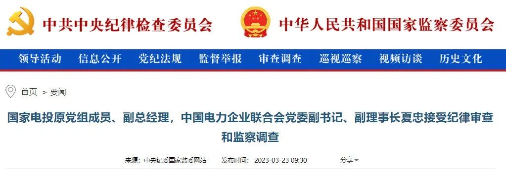 中央紀委國家監(jiān)委網(wǎng)站3月23日消息,國家電投原黨組成員、副總經(jīng)理,中國電力企業(yè)聯(lián)合會黨委副書記、副理事長夏忠涉嫌嚴重違紀違法,目前正接受中央紀委國家監(jiān)委駐國務院國資委紀檢監(jiān)察組和遼寧省盤錦市監(jiān)委紀律審查和監(jiān)察調查。