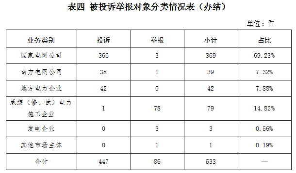 從被投訴舉報(bào)對象看,供電企業(yè)450件、占投訴舉報(bào)總數(shù)的84.43%,其中國家電網(wǎng)公司369件、占投訴舉報(bào)總數(shù)的69.23%,南方電網(wǎng)公司39件、占投訴舉報(bào)總數(shù)的7.32%,地方電力企業(yè)42件、占投訴舉報(bào)總數(shù)的7.88%;承裝(修、試)電力施工企業(yè)79件、占投訴舉報(bào)總數(shù)的14.82%;發(fā)電企業(yè)3件、占投訴舉報(bào)總數(shù)的0.56%;其他市場主體1件、占投訴舉報(bào)總數(shù)的0.19%。