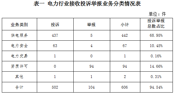 電力行業(yè)排在首位,數(shù)量為606件、占投訴舉報(bào)總數(shù)的94.54%,主要集中在供電服務(wù)、資質(zhì)許可、電力安全、電力交易等方面。