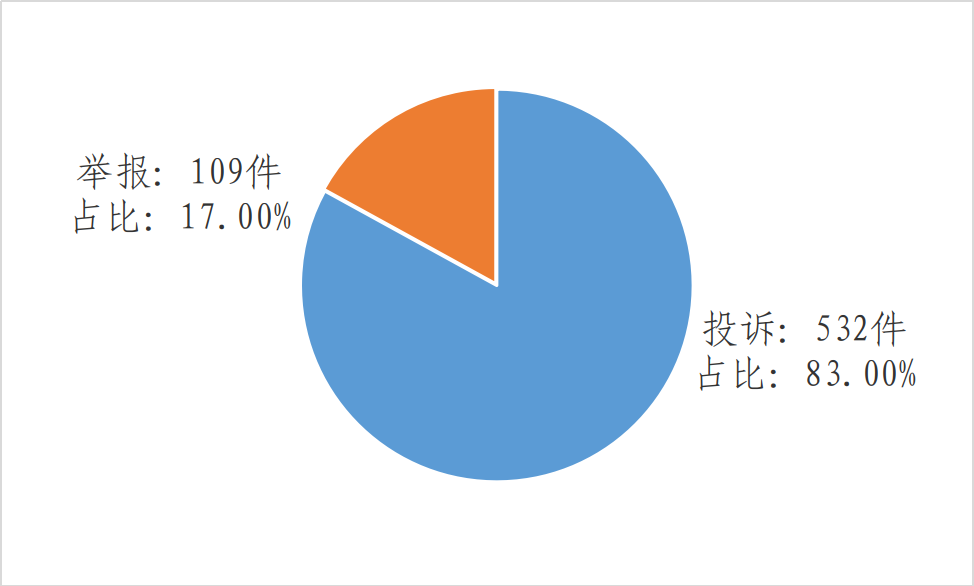 2023年4月,12398熱線共接收投訴舉報(bào)641件,環(huán)比增長1.26%、同比下降13.14%。其中:投訴532件,環(huán)比下降0.75%、同比下降27.12%;舉報(bào)109件,環(huán)比增長12.37%、同比增長105.66%。