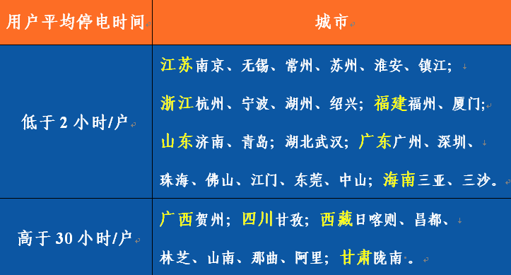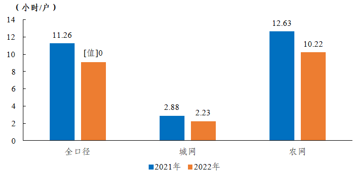 全國用戶平均停電時間9.10小時/戶,同比減少2.16小時/戶,其中城網(wǎng)2.23小時/戶,農(nóng)網(wǎng)10.22小時/戶。城網(wǎng)與農(nóng)網(wǎng)相差7.99小時/戶。