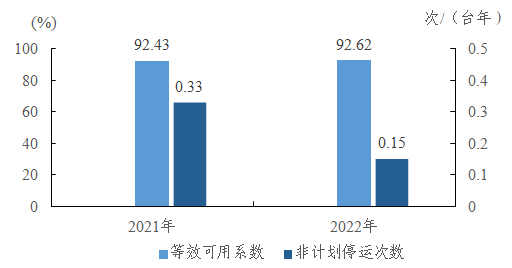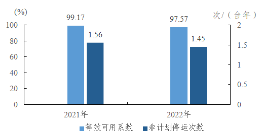 10萬千瓦及以上燃氣-蒸汽聯(lián)合循環(huán)機組等效可用系數(shù)92.62%,同比增加0.19個百分點;非計劃停運0.15次/臺年,同比下降0.18次/臺年。