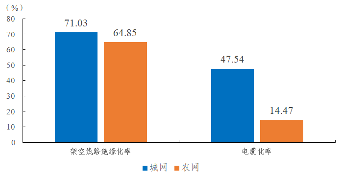 2022年,納入電力可靠性統(tǒng)計的10千伏用戶1241.01萬戶,用戶總?cè)萘?8.90億千伏安。城網(wǎng)、農(nóng)網(wǎng)架空線路絕緣化率分別為71.03%、64.85%,城網(wǎng)、農(nóng)網(wǎng)電纜化率分別為47.54%、14.47%。