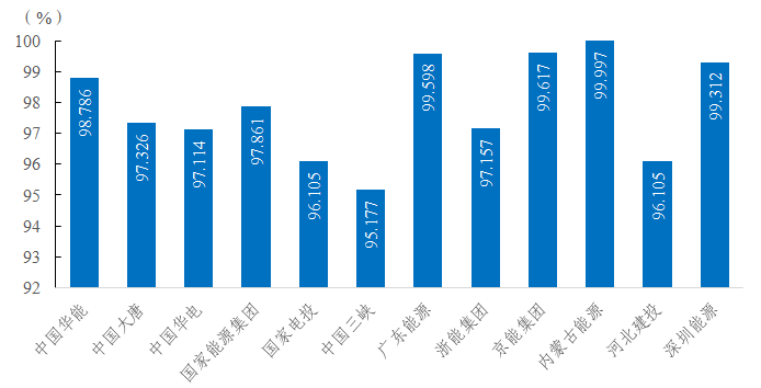 2022年,發(fā)電側(cè)12家集團公司變壓器可用系數(shù)前三位分別是內(nèi)蒙古能源集團有限公司99.997%、北京能源集團有限責任公司99.617%、廣東省能源集團有限公司99.598%。