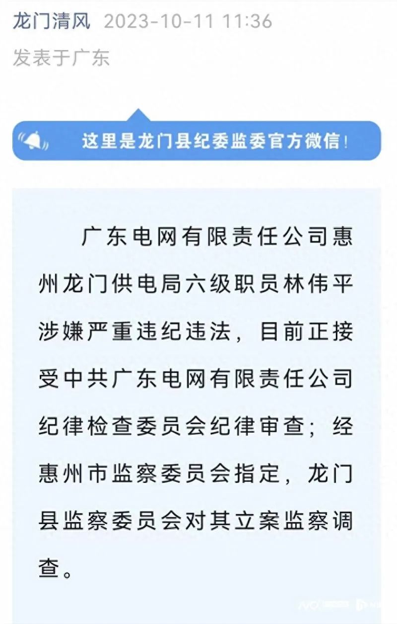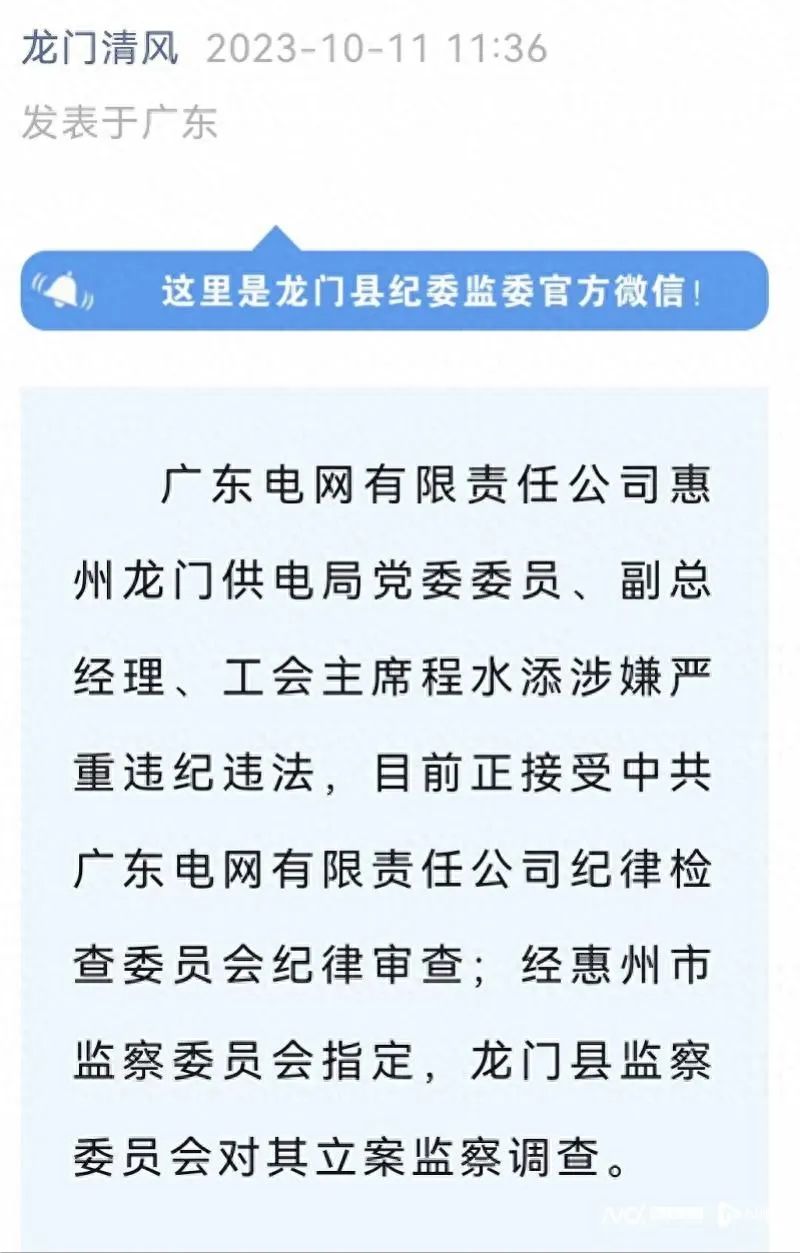 南都訊 記者黃海林 10月11日,惠州市龍門縣紀(jì)委監(jiān)委官方微信“龍門清風(fēng)”發(fā)布消息:廣東電網(wǎng)有限責(zé)任公司惠州龍門供電局黨委委員、副總經(jīng)理、工會(huì)主席程水添,廣東電網(wǎng)有限責(zé)任公司惠州龍門供電局六級(jí)職員林偉平涉嫌嚴(yán)重違紀(jì)違法,目前正接受中共廣東電網(wǎng)有限責(zé)任公司紀(jì)律檢查委員會(huì)紀(jì)律審查;經(jīng)惠州市監(jiān)察委員會(huì)指定,龍門縣監(jiān)察委員會(huì)對(duì)他們立案監(jiān)察調(diào)查。