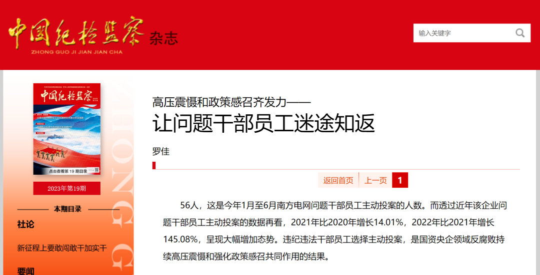 最新一期《中國(guó)紀(jì)檢監(jiān)察》雜志刊發(fā)了《高壓震懾和政策感召齊發(fā)力—— 讓問題干部員工迷途知返》一文,文中透露,今年1月至6月,南方電網(wǎng)共有56名問題干部員工主動(dòng)“投案”。