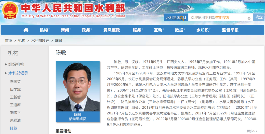 水利部網(wǎng)站“機(jī)構(gòu)”一欄更新后顯示,此前任應(yīng)急管理部防汛抗旱司司長(zhǎng)的陳敏已任水利部黨組成員。