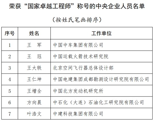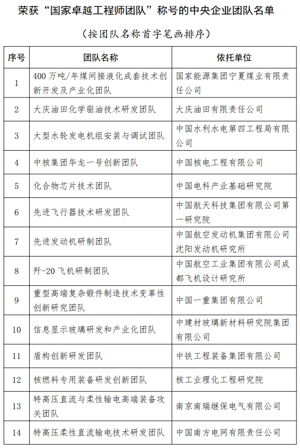 中央企業(yè)共有王軍等29名工程科技人才榮獲“國家卓越工程師”稱號,400萬噸/年煤間接液化成套技術(shù)創(chuàng)新開發(fā)及產(chǎn)業(yè)化團(tuán)隊(duì)等20個(gè)團(tuán)隊(duì)榮獲“國家卓越工程師團(tuán)隊(duì)”稱號。