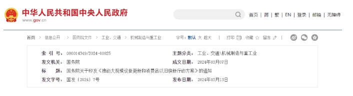 國務(wù)院關(guān)于印發(fā)《推動大規(guī)模設(shè)備更新和消費品以舊換新行動方案》的通知